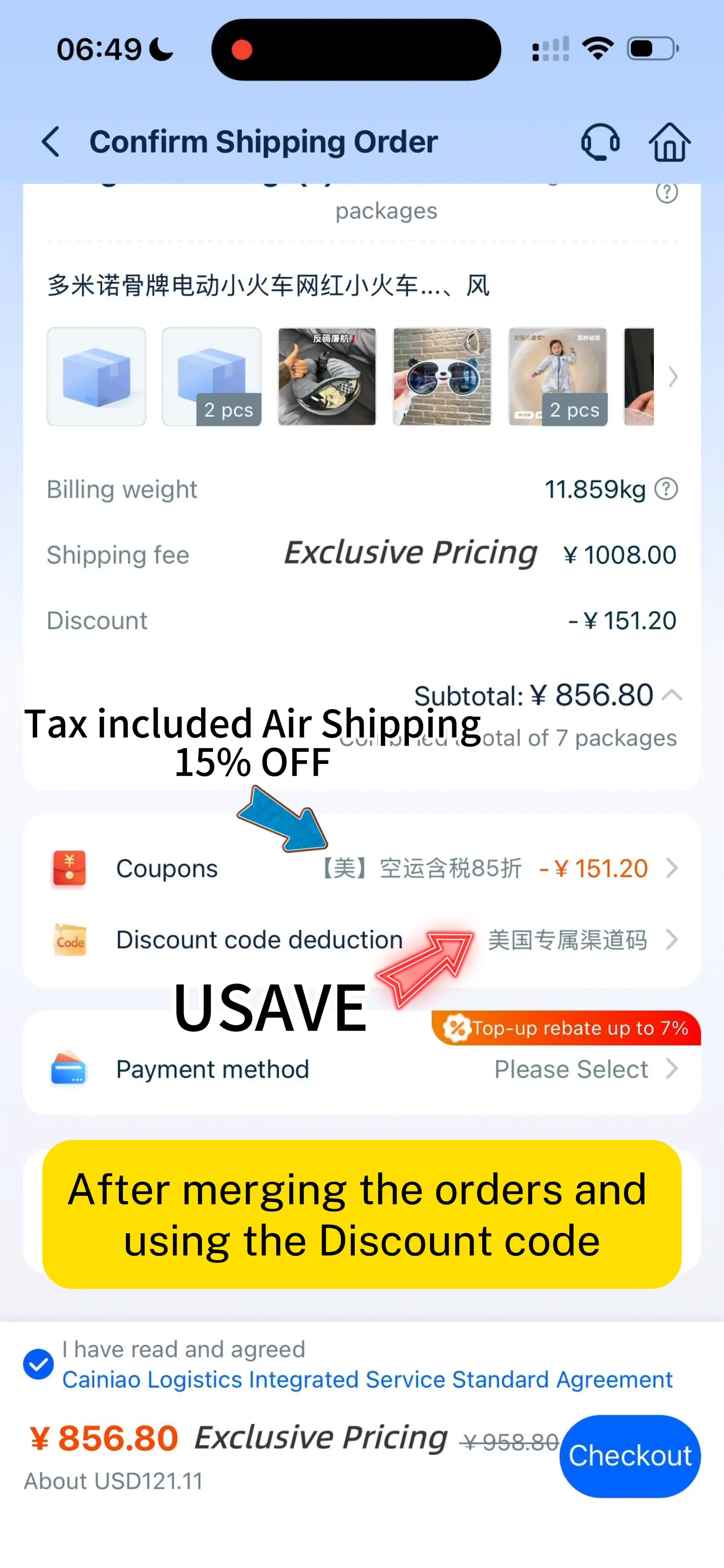 Once both are applied, you'll see the total drop significantly — in my case, from ¥1008 to ¥856 RMB (about $120 USD).