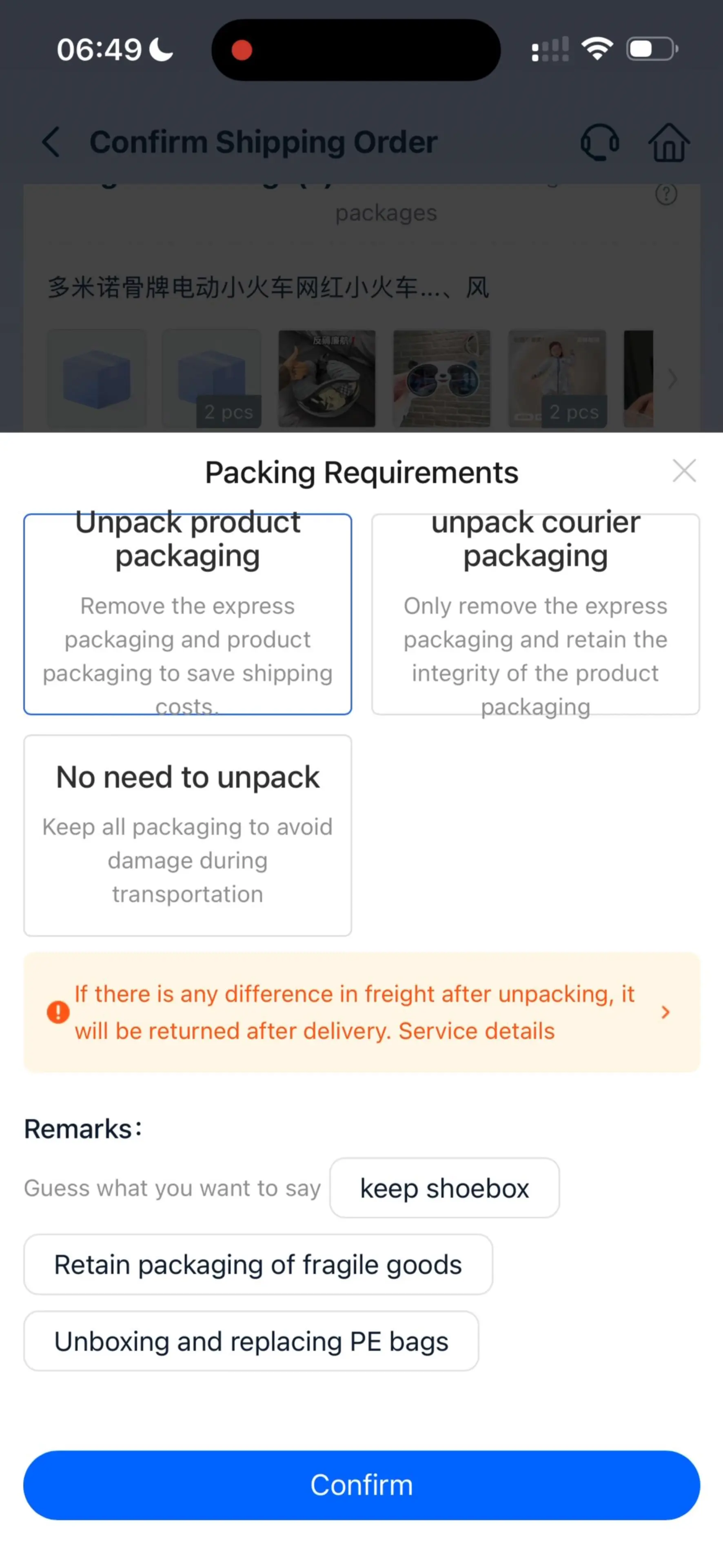 This option allows CAINIAO staff to remove unnecessary boxes, fillers, and wrapping from your items before repackaging. It's particularly useful if you're shipping toys, clothes, or everyday goods — basically anything that doesn't need the original retail box.